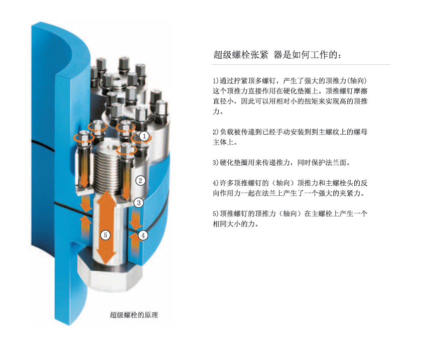 超級螺栓張緊器被設(shè)計(jì)來直接取代傳統(tǒng)的螺母和螺栓。這些裝置可以旋合于一個新的或者現(xiàn)有的螺栓,螺柱,螺桿或者軸上。主螺紋用于安置緊張器在螺栓或者螺柱上并靠在硬化墊圈及承載面上,一旦安置到位,螺栓或者螺柱的實(shí)際的張緊通過簡單的手動工具來擰緊環(huán)繞主螺紋一圈的頂推螺釘來實(shí)現(xiàn)。頂推螺釘均勻地傳遞預(yù)緊力到主螺紋上,從而,也傳遞到連接件上。主螺紋被純張力鎖緊。